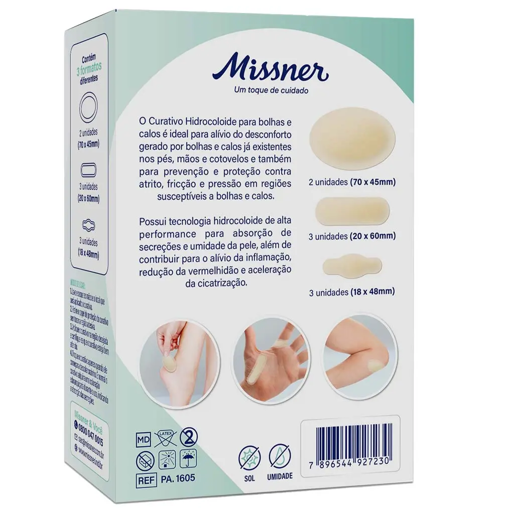 O Curativo Hidrocoloide para bolhas e calos é ideal para alivio do desconforto gerado por bolhas e calos já existentes nos pés, mãos e cotovelos e também para prevenção e proteção contra atrito, ficção e pressão em regiões susceptíveis a bolhas e calos. Possui tecnologia hidrocoloide de alta performance para absorção de secreções e umidade da pele, além de contribuir para o alivio da inflamação, redução da vermelhidão e aceleração da cicatrização.